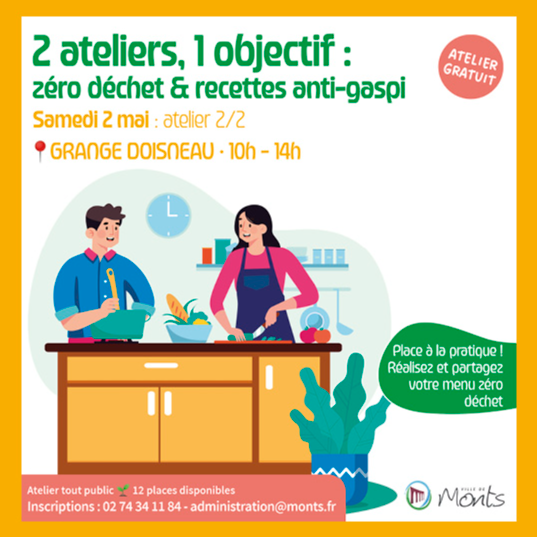 Second des deux ateliers cuisine ; le premier est programmé le samedi 4 avril (10h - 12h) avec animations ludiques et échanges pour comprendre le gaspillage alimentaire, ses impacts et repartir avec des gestes simples pour le quotidien (cliquer ici).